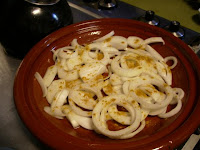 The only thing to remember when cooking with a tagine is to have a heat diffuser and use very very low heat. The diffuser is a thing you put on your burner so that heat can be spread out evenly. First you add olive oil (Angel also bought us some fancy oil from France!)